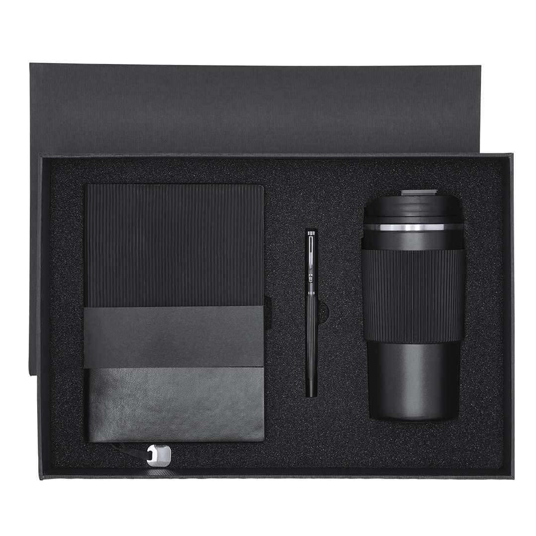 Elegante set premium composto da:Thermos tumbler in acciaio inossidabile a doppia parete da 470 ml in elegante nero. Con coperchio dosatore coordinato e facile da aprire, senza BPA, fascia in silicone coordinata e base antiscivolo. Taccuino con copertina morbida in pelle PU liscia in elegante colore nero, che combina texture lisce e smussate. Include segnalibro in tessuto e una speciale targhetta metallica per incisione laser. Interno con 100 fogli color crema, layout a righe singole e bordi neri.Penna roller con finitura nera opaca e dettagli metallici argento. Corpo smussato, clip nascosto e inchiostro blu. Include una presa comoda in metallo lucido.Set presentato in una custodia singola con finitura opaca, con ritagli interni per ciascuno degli elementi del set.