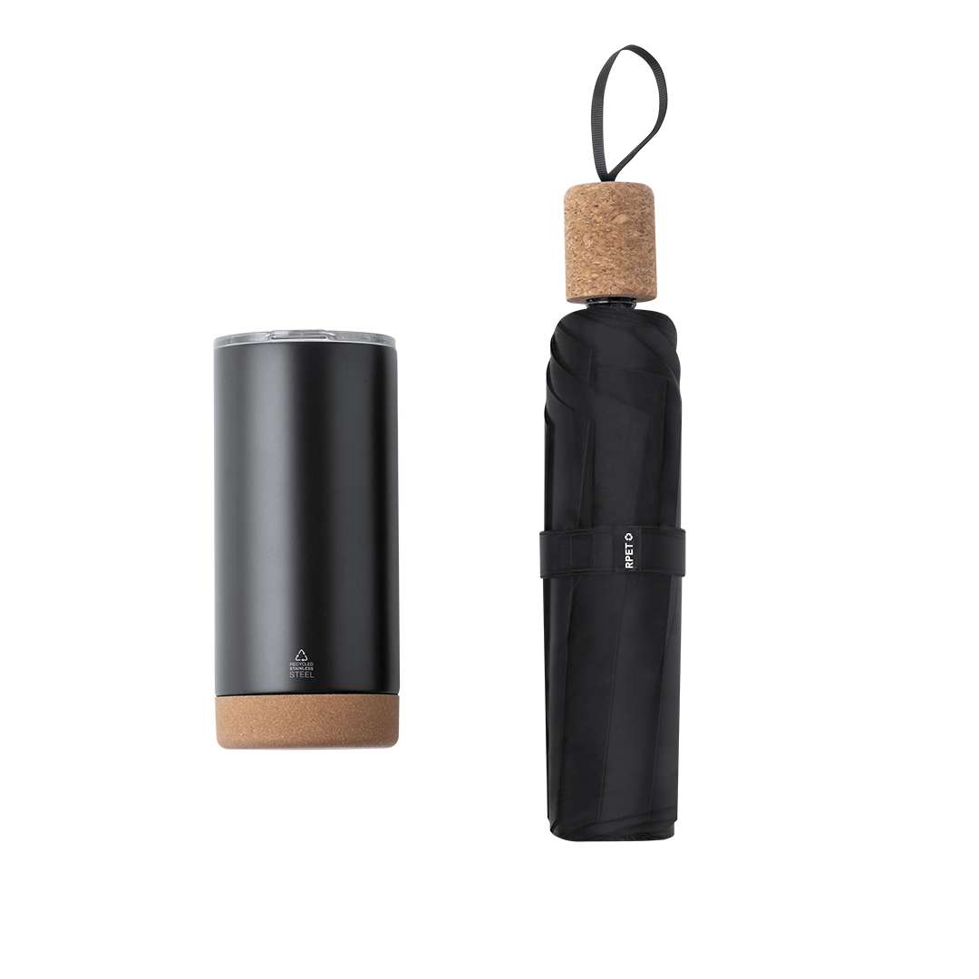 Elegante set premium che comprende: Bicchiere termico a doppia parete in acciaio inox riciclato con capacità di 550 ml ed elegante finitura nera opaca. Base in sughero, con coperchio a pressione e dispenser. È ideale per la tua scrivania, tavolo o qualsiasi superficie dove puoi goderti la tua bevanda preferita. Ombrello nero pieghevole dal diametro di 98 cm. In materiale pongee 190T RPET e manico in sughero. Apertura manuale, con sistema anti-vento e stecche in fibra di vetro. Con marchio distintivo RPET. Set presentato in una scatola individuale con finitura opaca, con fustellatura interna per ogni elemento del set. Il materiale RPET è realizzato con plastica riciclata, per promuovere il riutilizzo dei rifiuti plastici e contribuire alla sostenibilità del pianeta