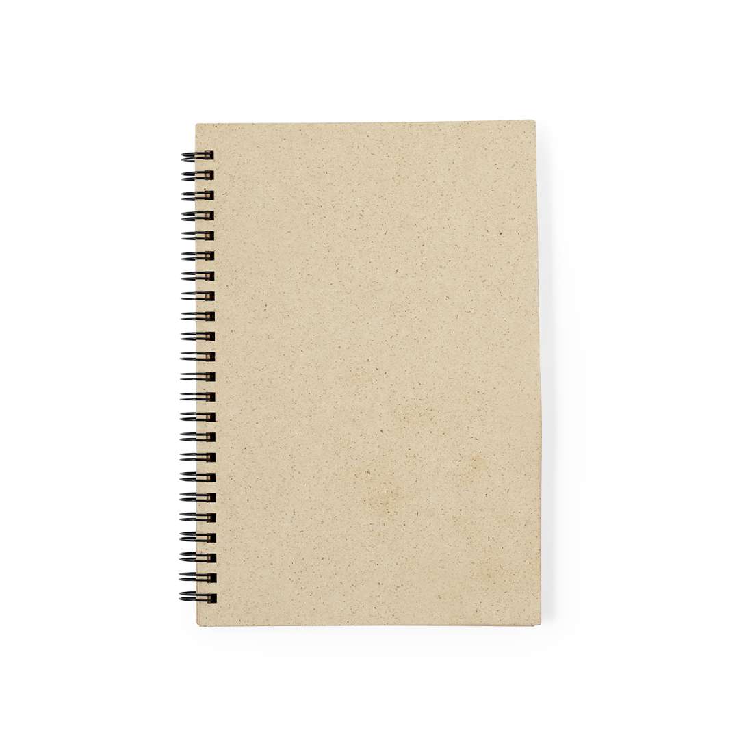 Raccoglitore A5 a doppio anello con copertin rigida in erba riciclata. 80 fogli con layout a riga singola, finitura kraft. Logo Grass Paper sulle pagine e sul retro della copertina. Presentato in una busta individuale. La carta d'erba è un'alternativa perfetta che garantisce la sostenibilità del suo processo di produzione, riducendo l'impatto ambientale grazie alla rapida crescita e alla scarsa richiesta di risorse necessarie per la sua coltivazione. Inoltre, il 50% di carta a base di erba è combinato con altri elementi ecologici, come il legno riciclato.