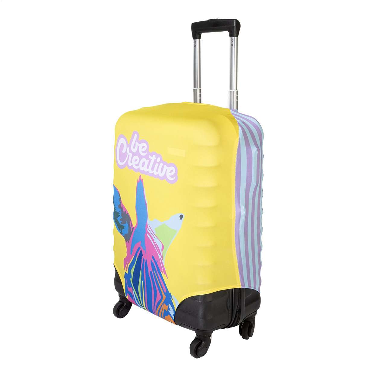 Copertura per valigia in RPET personalizzabile con grafica stampata in sublimazione su tutta la superficie, chiusura in velcro ed etichetta RPET. Compatibile con valigie di medie dimensioni fino a 42x62x26 cm. 92% poliestere RPET e 8% elastan (185 g/m²), Quantità minima ordinabile: 25 pezzi.