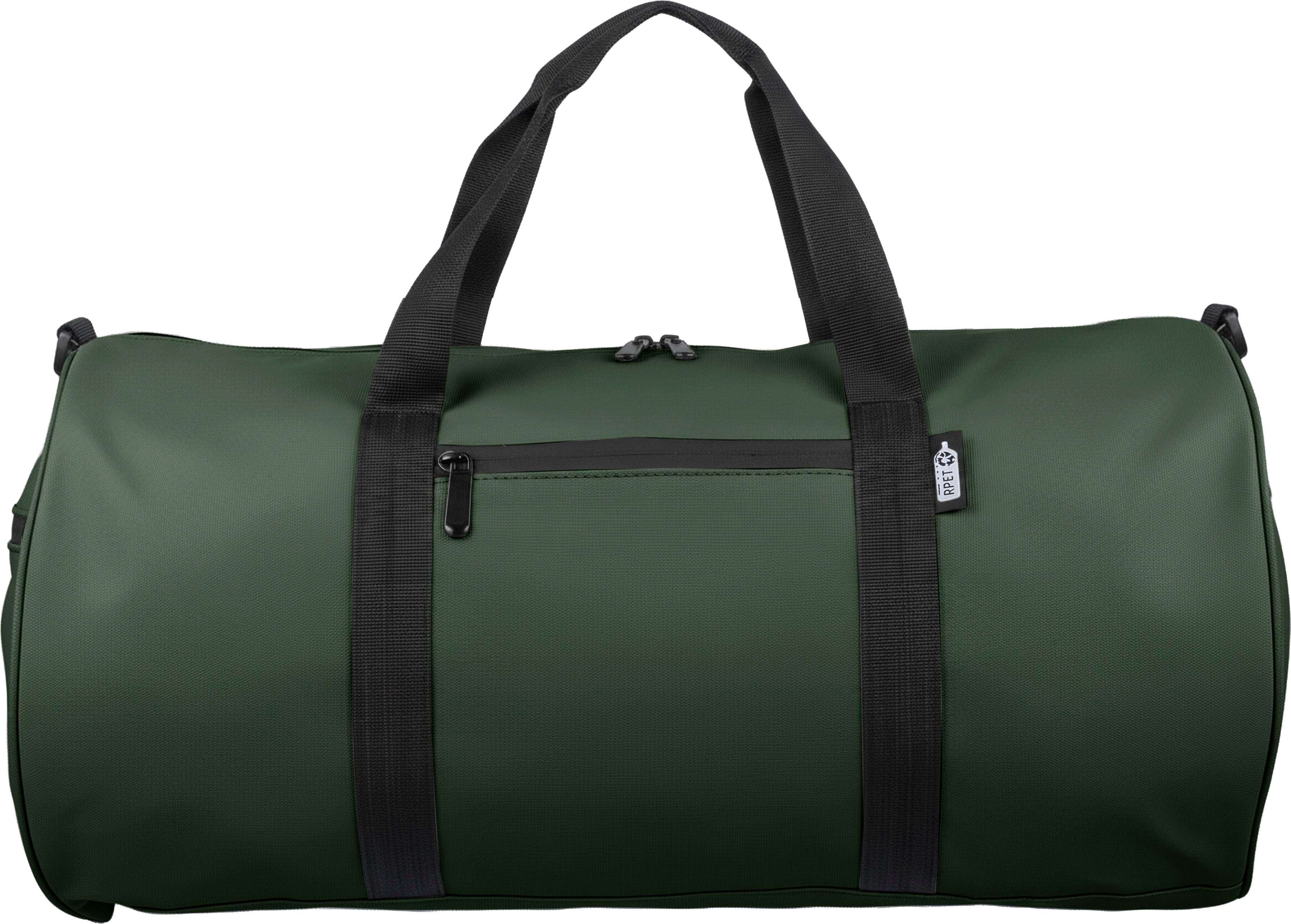 Borsa da viaggio rPET realizzata in poliestere 600D con fodera 210D e rivestimento in PU idrorepellente, dotata di ampio scomparto principale con zip, piccola tasca frontale con zip a scopo decorativo, ulteriore piccola tasca laterale con zip e tasca laterale in rete, dotata di due manici e tracolla regolabile, capacità 40 litri, con etichetta rPET esterna