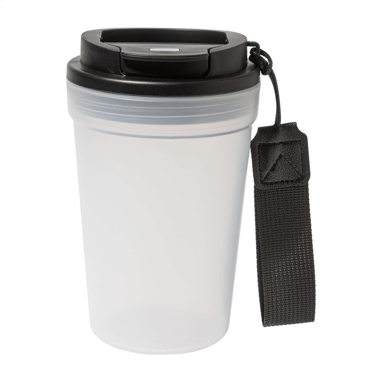 Bicchiere da viaggio da 400ml in plastica PP a parete singola con finitura satinata, coperchio salvagoccia e fascetta in poliestere RPET.