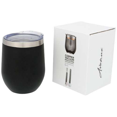 Il bicchiere termico sottovuoto Corzo in rame ha una struttura sottovuoto a doppia parete con isolamento in rame per mantenere le bevande calde per 6 ore e fredde per 24 ore. La struttura impedisce la formazione della condensa sulla parte esterna della tazza. Facile da sorseggiare e coperchio a pressione. Caratterizzato da verniciatura in polvere a spruzzo sul corpo esterno. Ampia apertura per un comodo riempimento e versamento. Capacità di 350 ml. Presentata in una confezione regalo Avenue.