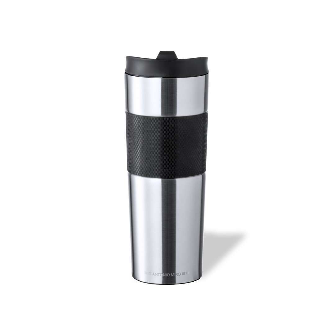 Bicchiere termico da tavolo by Antonio Miró. Realizzato in acciaio inox a doppia parete con capacità di 450 ml. È ideale per la tua scrivania, tavolo o qualsiasi superficie dove puoi goderti la tua bevanda preferita. Finitura opaca, con elegante striscia centrale e logo del marchio sul fondo. Coperchio di facile apertura e BPA Free. Confezionato singolarmente in un'elegante scatola nera con logo Antonio Miró.
