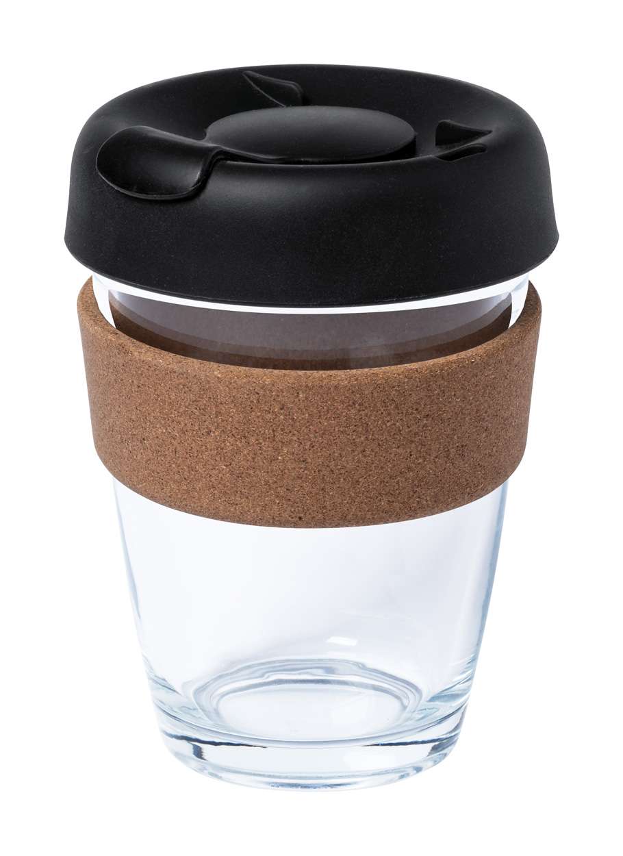 Tazza da asporto in vetro borosilicato monoparete con fascia in sughero naturale e coperchio in silicone, 350 ml.