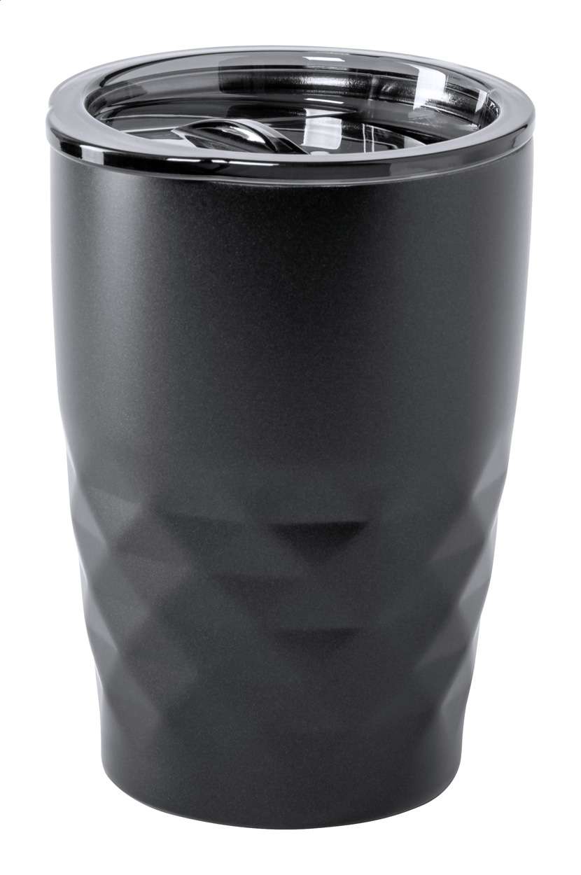 Mug termico da 350ml. in acciaio a doppia parete con tappo erogatore in plastica ed isolamento in rame che permette di mantenere il contenuto caldo per 12 ore e freddo per 24 ore.