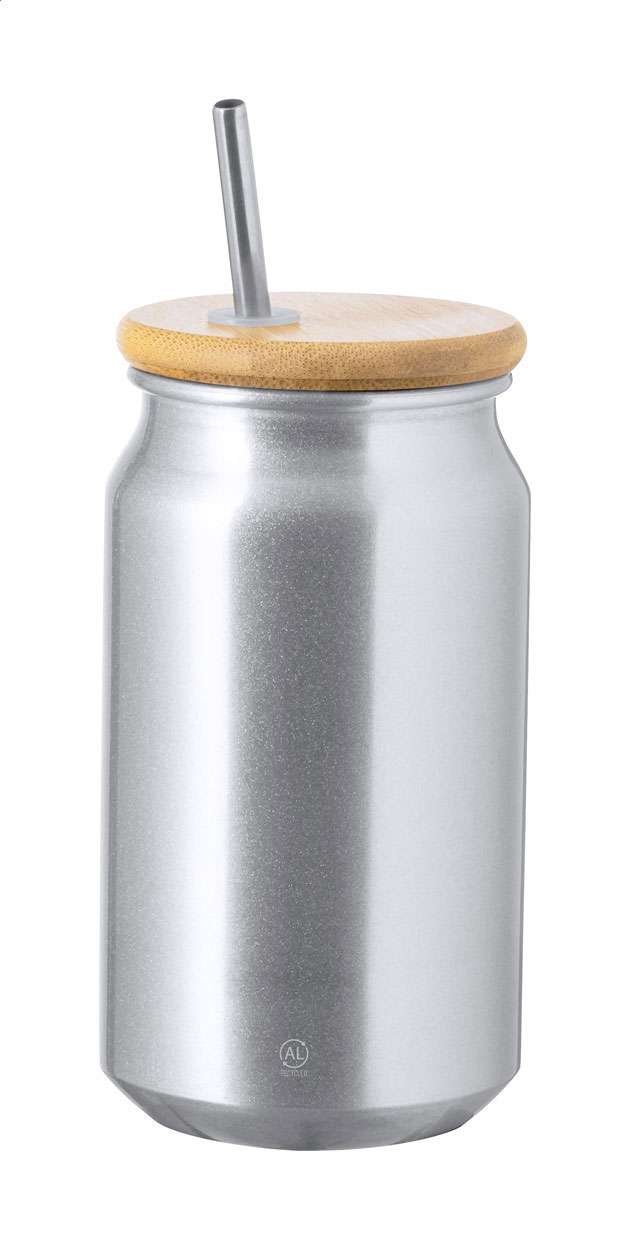 Tazza barattolo da 430 ml. in alluminio riciclato con coperchio in bambù e cannuccia in acciaio inossidabile. In scatola di cartoncino kraft.