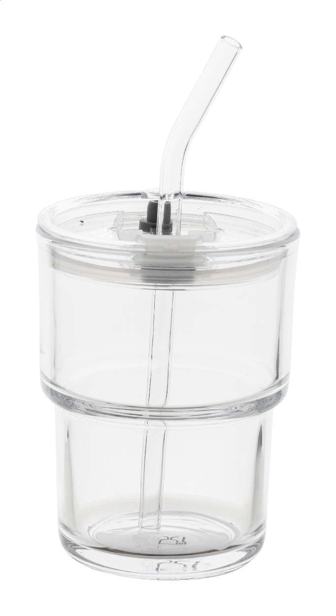 Tazza in vetro da 400ml. con coperchio in plastica e cannuccia in vetro.