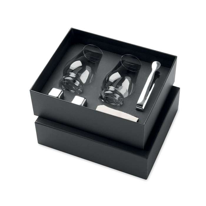 Set di 2 bicchieri da degustazione (200 ml) per whisky o altri liquori, 2 cubetti di ghiaccio riutilizzabili in acciaio inox, pinze e sacchetto di cotone per la conservazione dei cubetti di ghiaccio.