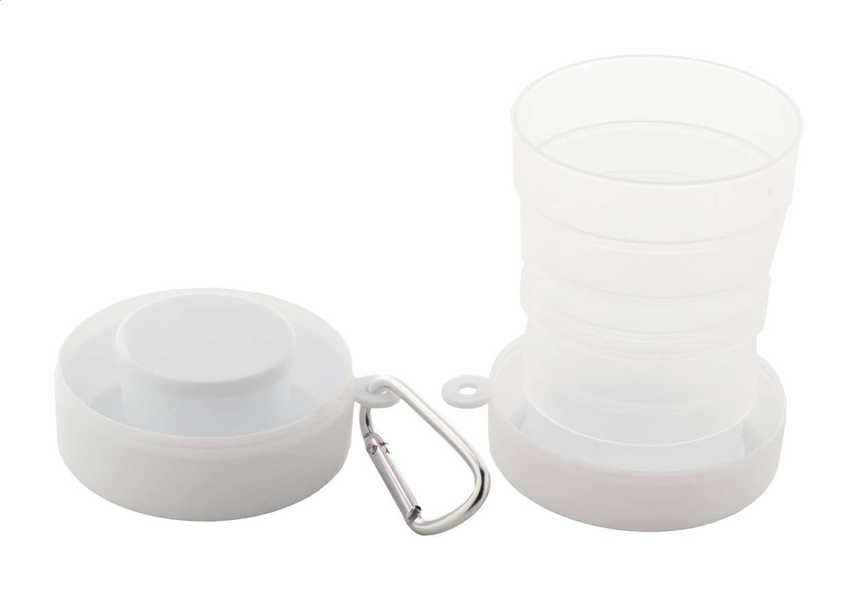 Bicchiere pieghevole da 220ml. in plastica PP riciclata con scomparto portapillole e moschettone in metallo. Senza BPA.