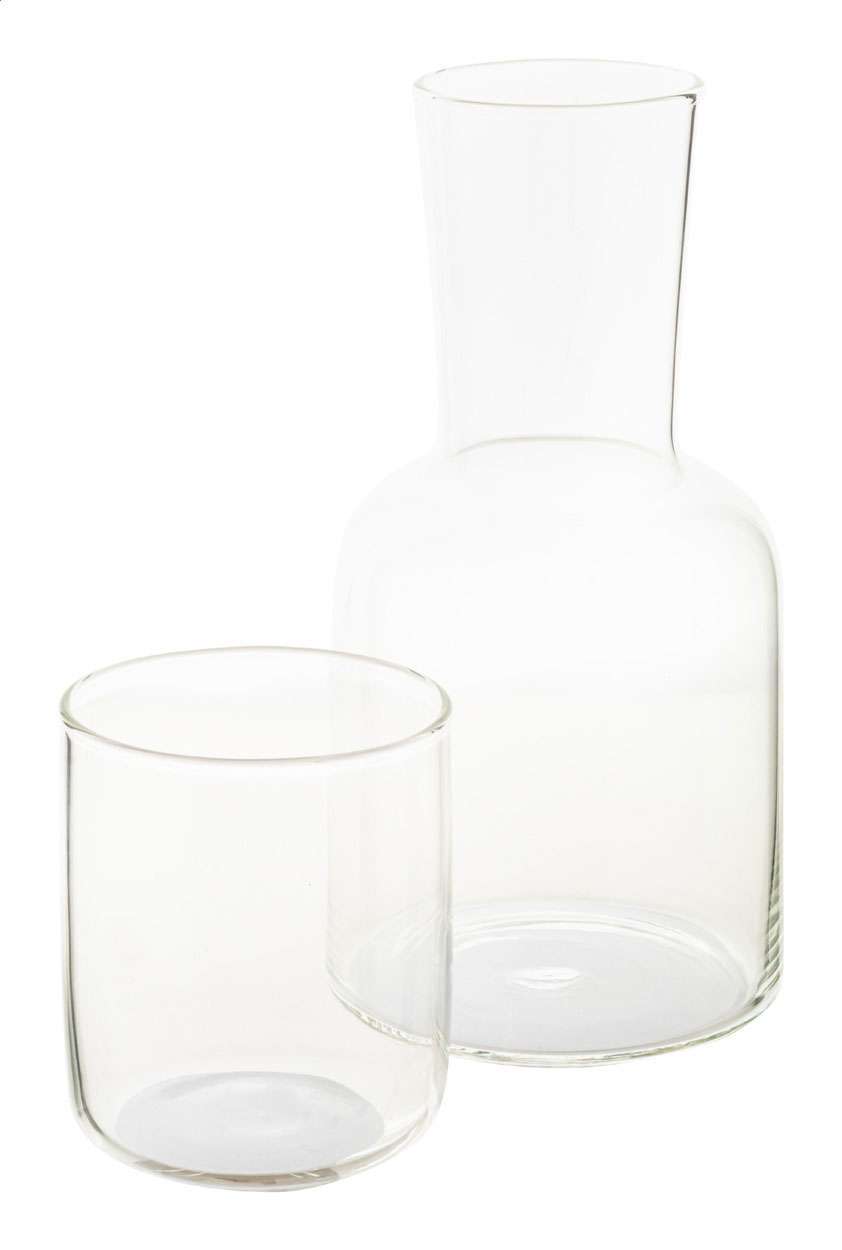 Set composto da caraffa per acqua in vetro borosilicato (800 ml) e bicchiere in vetro (300 ml). Set adatto sia per bevande fredde che calde, la caraffa può essere utilizzata anche come bottiglia decanter. Confezione in scatola di cartoncino bianco.