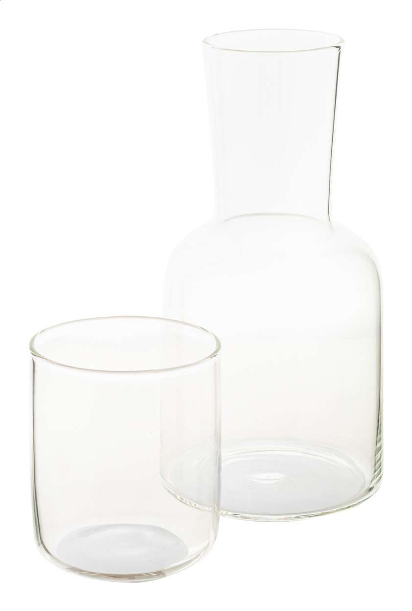 Set composto da caraffa per acqua in vetro borosilicato (800 ml) e bicchiere in vetro (300 ml). Set adatto sia per bevande fredde che calde, la caraffa può essere utilizzata anche come bottiglia decanter. Confezione in scatola di cartoncino bianco.