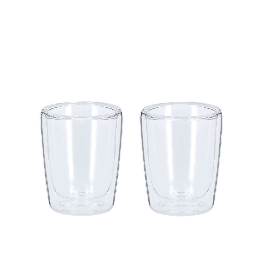 Elegante set di bicchieri in vetro borosilicato a doppia parete. Include due bicchieri, ognuno con una capacità di 65 ml. Presentati in una scatola sagomata.