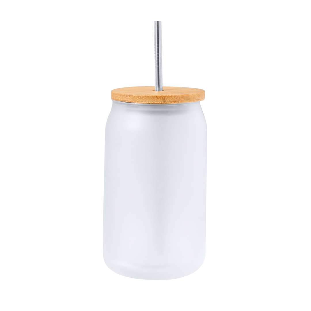Barattolo per la sublimazione con corpo in vetro smerigliato resistente, capacità 400 ml. Coperchio a pressione in bambù con foro per la cannuccia (cannuccia inclusa e realizzata in acciaio inox). Appositamente progettato per la marcatura a sublimazione. Presentato in una scatola kraft individuale.