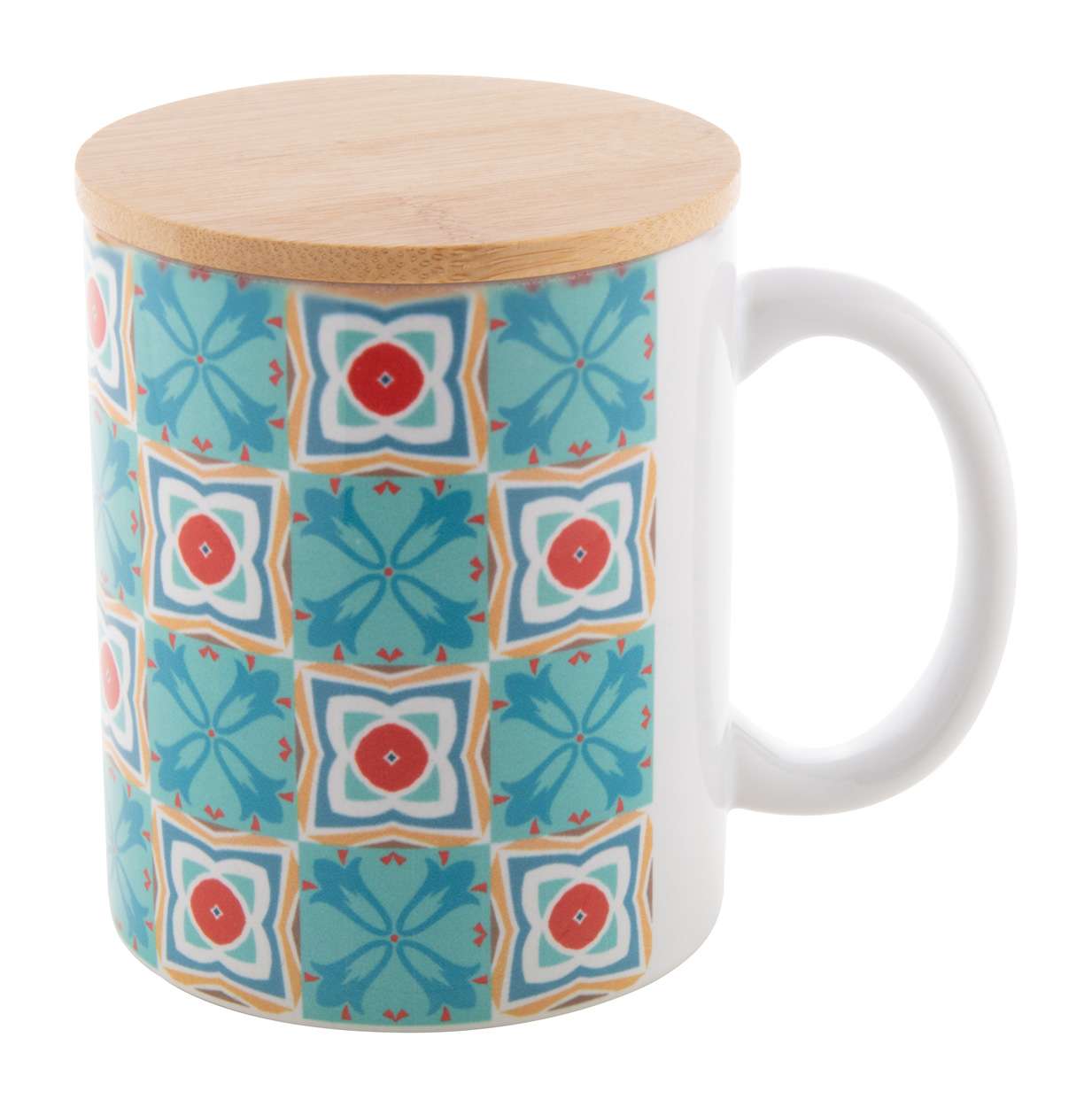 Tazza in ceramica bianca da 300ml. per stampa in sublimazione, lavabile in lavastoviglie e coperchio in bambù. Confezione in scatola di cartoncino bianco.