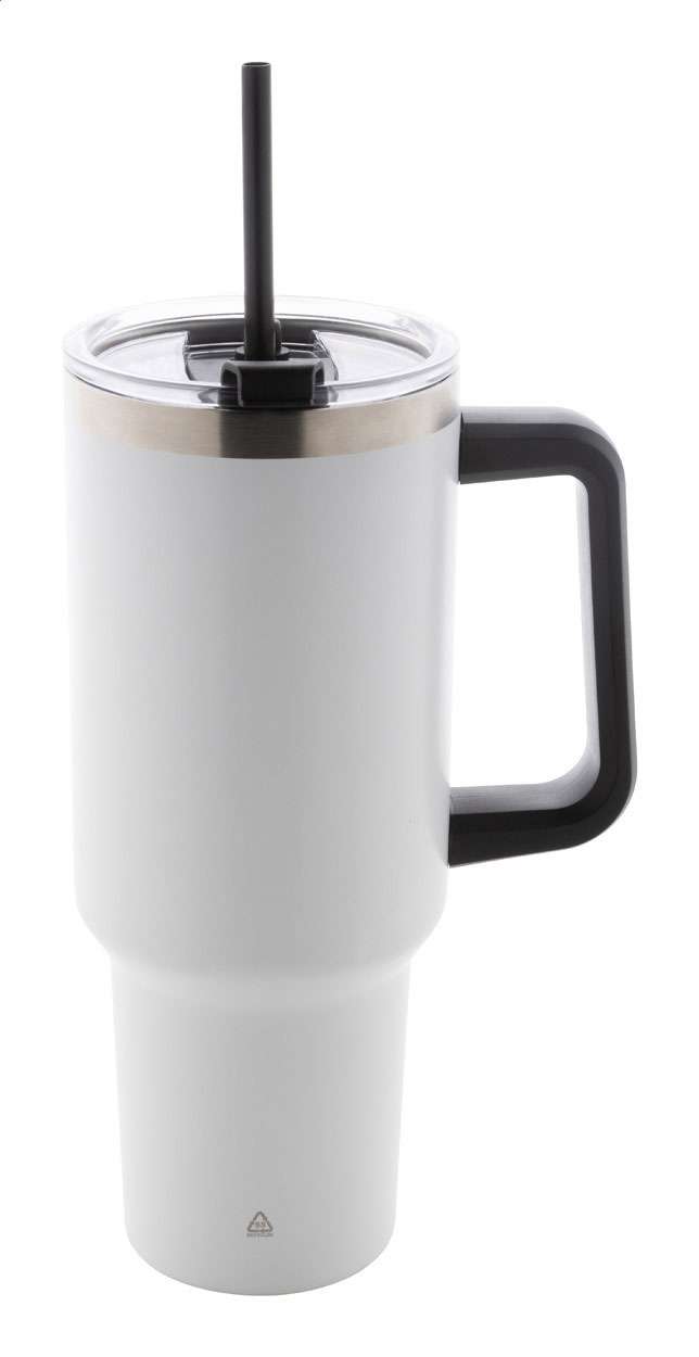 Tazza termica isotermica da 1200 ml. in acciaio riciclato a doppia parete, con coperchio in PS e cannuccia in PP.