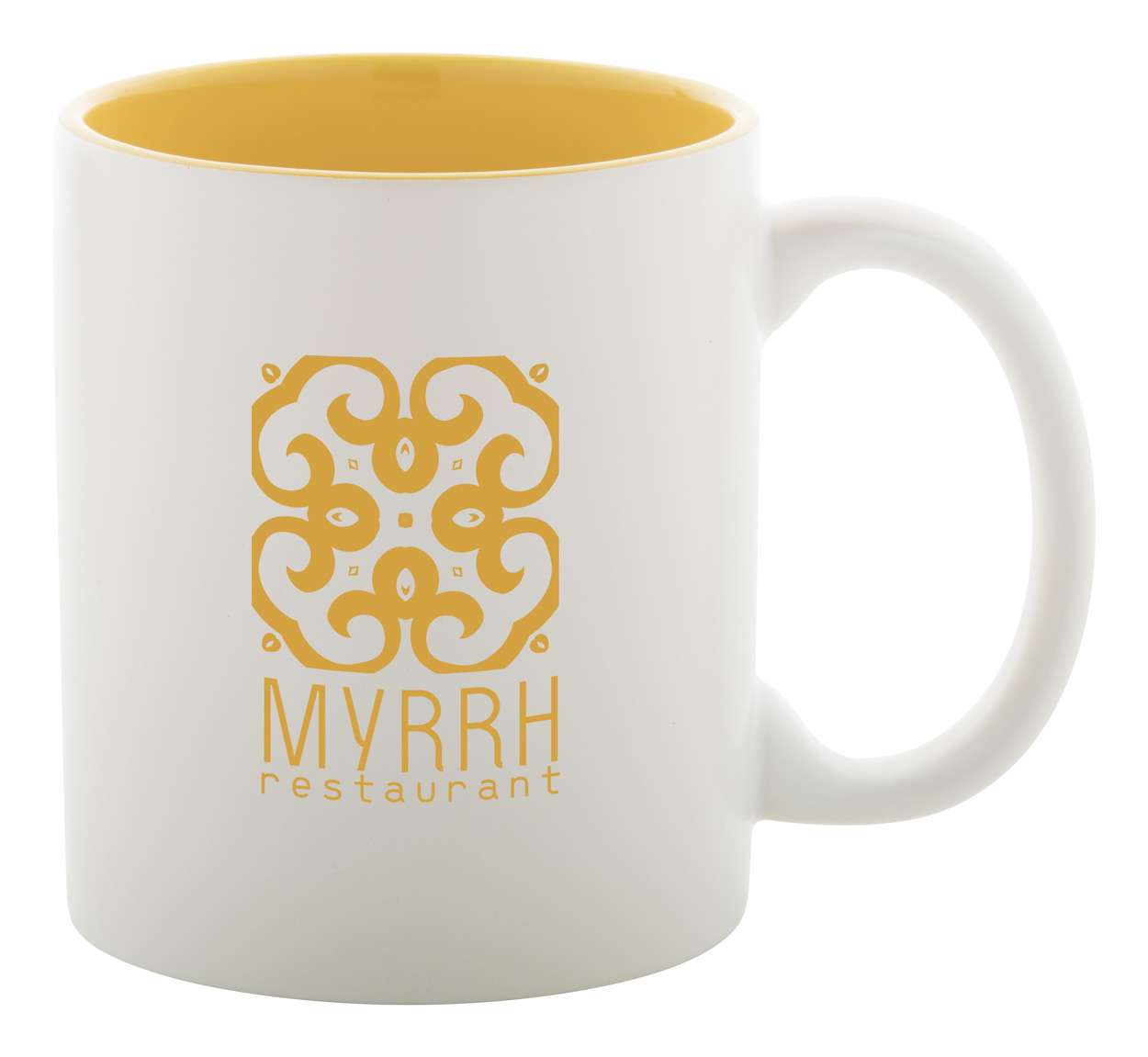 Tazza in ceramica bianca da 350 ml. con interno colorato e speciale rivestimento esterno ideale per incisione; il logo inciso avrà lo stesso colore dell'interno della tazza. Fornita in confezione regalo.