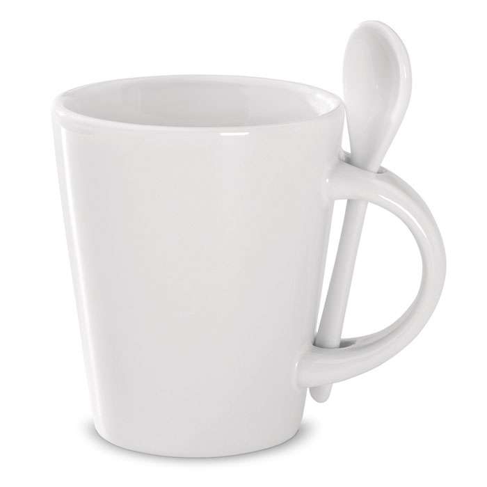 Tazza in porcellana con cucchiaino. Rivestimento speciale indicato per la stampa in sublimazione. Capacità 300 ml.