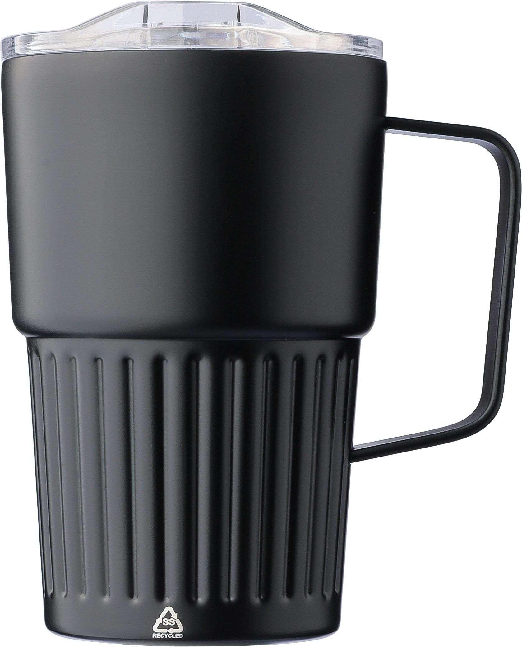 Tazza termica da viaggio in acciaio inox riciclato, doppia parete, con interno in acciaio inox 304 ed esterno in acciaio inox 201. Dotata di impugnatura a coste e manico robusto per una presa sicura. Il coperchio è in AS con chiusura a scorrimento, sulla parte frontale è inciso il logo “acciaio inox riciclato”, capacità 450 ml, confezionata singolarmente in una scatola in cartone avana.