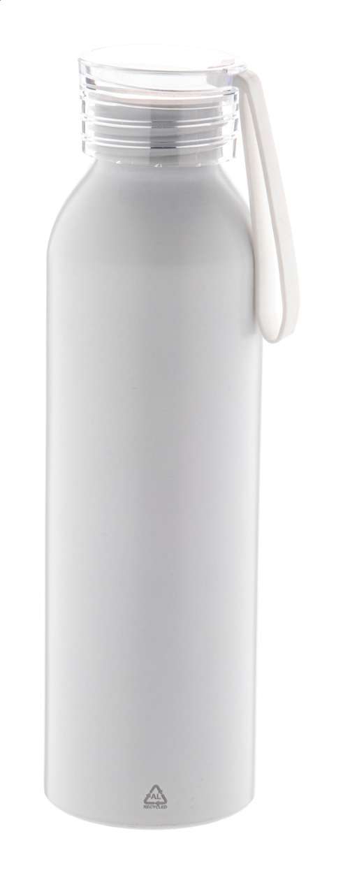 Borraccia da 600ml. in alluminio riciclato con tappo in colore coordinato e laccetto in silicone.