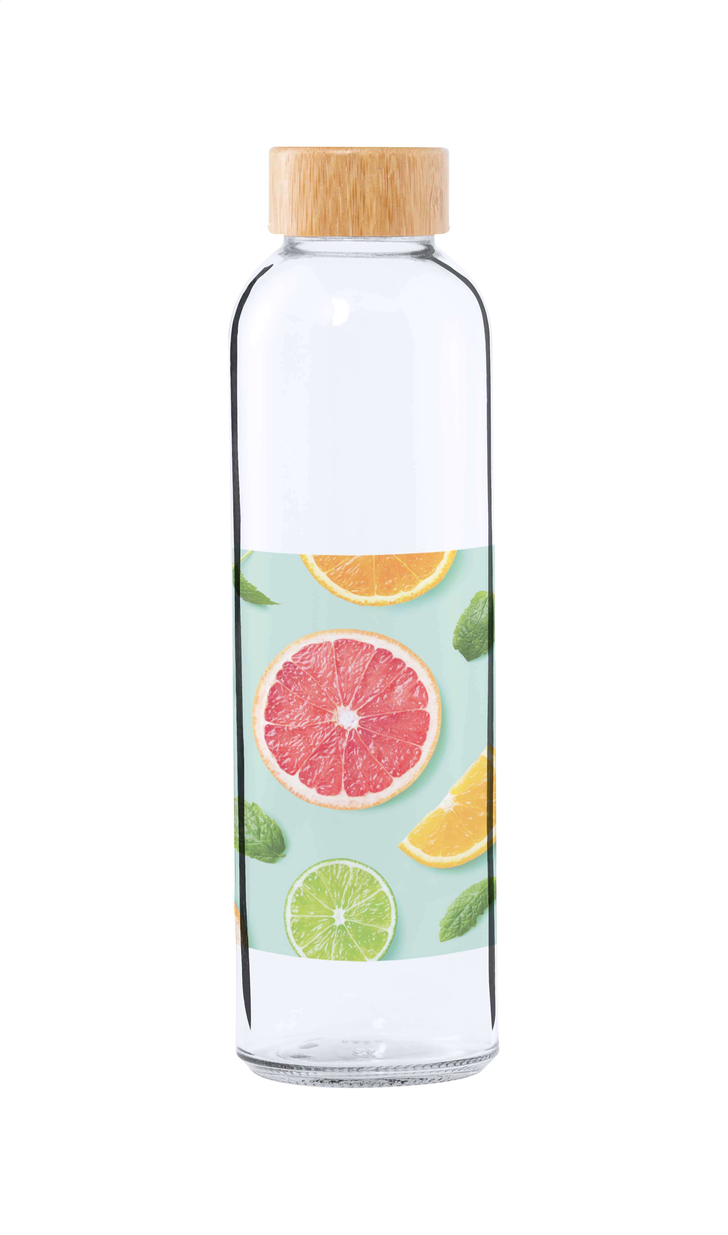 Borraccia da 500ml. in vetro con tappo in bambù. Non adatta per l'utilizzo con bevande gassate.