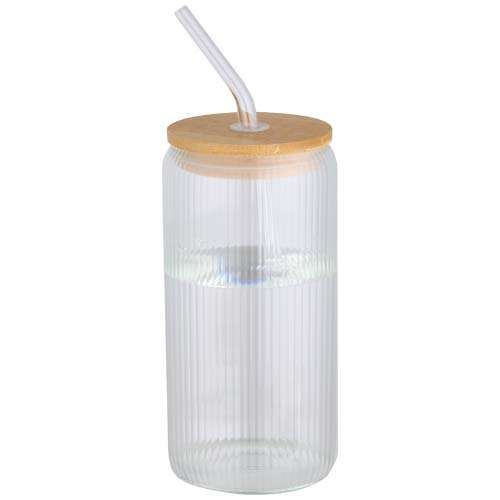 Contenitore in vetro borosilicato con cannuccia di vetro e coperchio in bambù. L'interno del contenitore è caratterizzato da un design scanalato mentre la superficie esterna liscia è ideale per la stampa di un logo. Il bambù utilizzato proviene da fonti sostenibili, responsabili dal punto di vista ambientale e sociale. Fornito in una confezione regalo in cartone riciclato. Capacità: 650 ml.