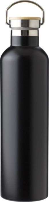 Borraccia in acciaio inox 304 a doppia parete, tappo a vite in bambù, capacità 1.000 ml. Le bevande restano calde fino a 12 ore, mentre bevande fredde fino a 18 ore.