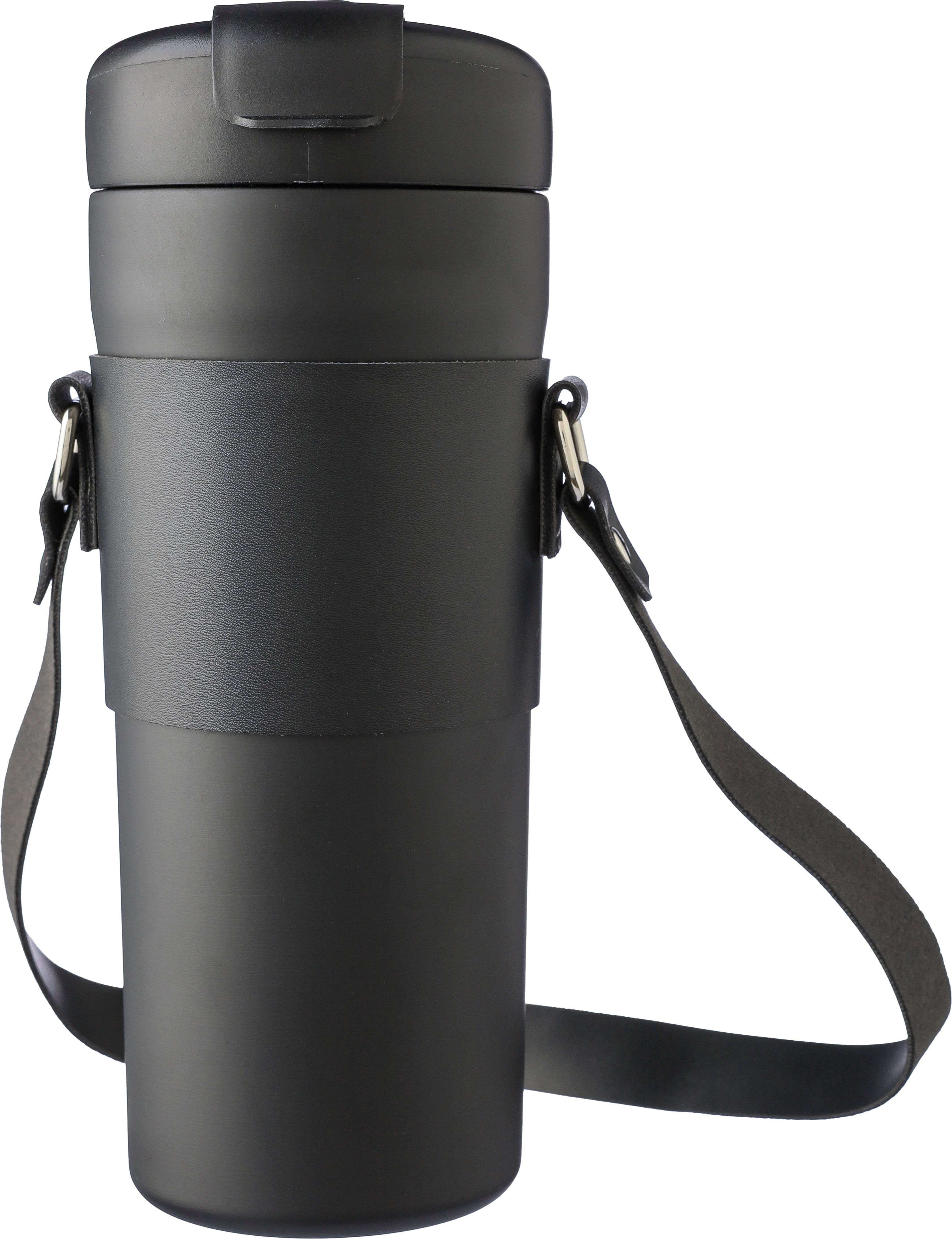 Borraccia in acciaio inox 304 (esterno acciaio inox 201), doppia parete, custodia in PU, cannuccia e tracolla, coperchio in PP con pulsante per aprire o chiudere il beccuccio e apertura separata per bere, mantiene il contenuto caldo per 6 ore e freddo per 10 ore, confezionato singolarmente in una scatola in cartone avana, capacità 730 ml