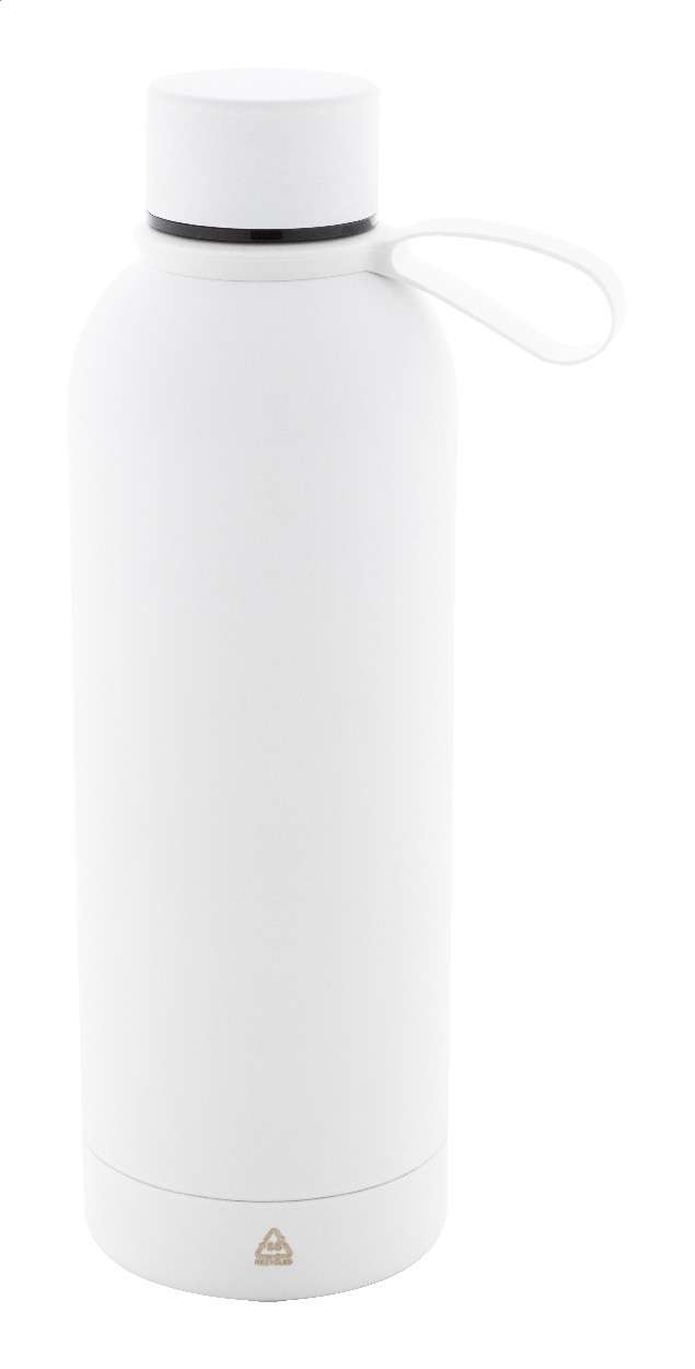Borraccia in acciaio riciclato a doppia parete da 500ml con finitura gommata e cinghia in silicone.