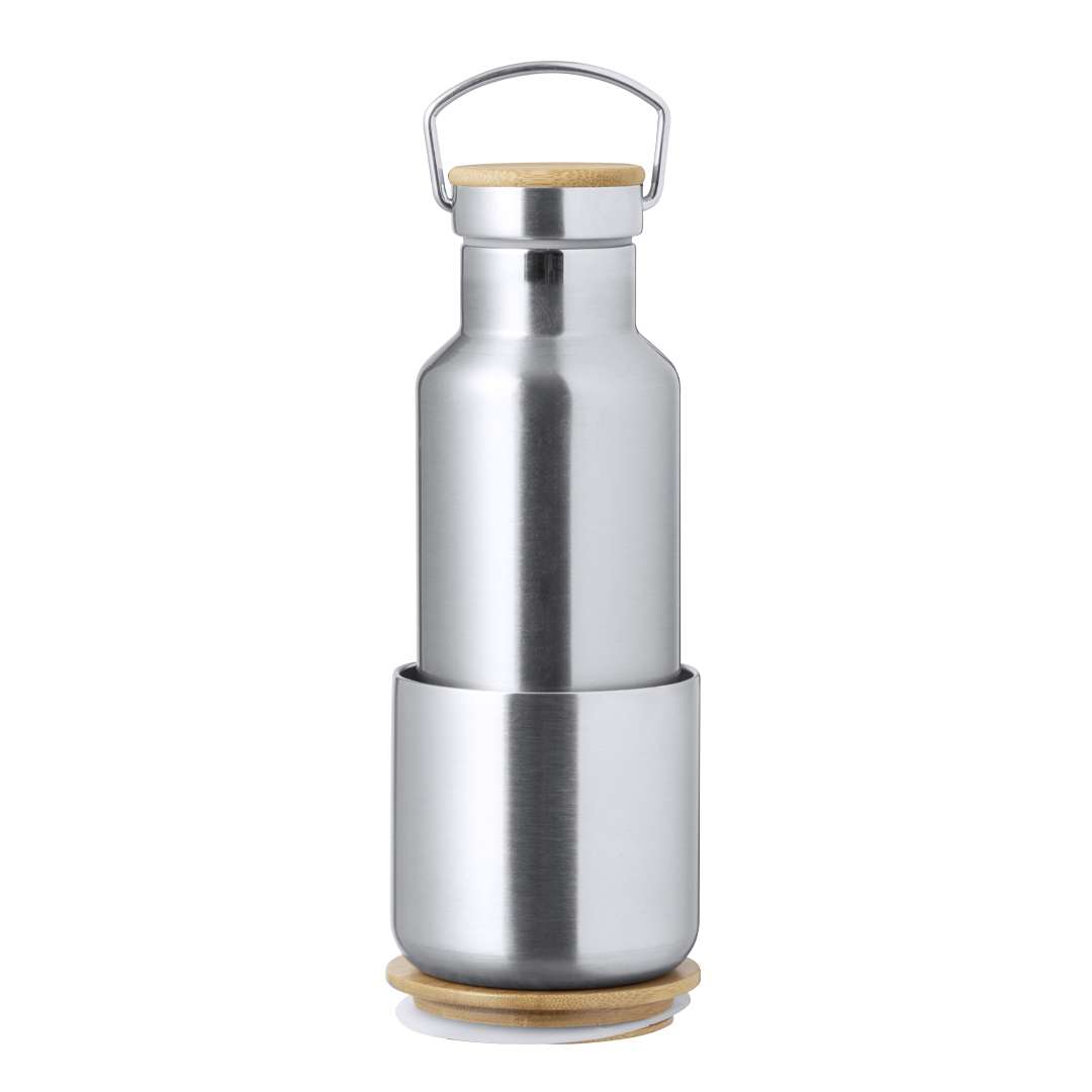 Pratico set composto da borraccia e bicchiere in acciaio inox. Include una borraccia termica in acciaio inox da 500 ml, con tappo di sicurezza a vite, base in bambù e maniglia per il trasporto. Comprende anche 1 bicchiere in acciaio inox da 300 ml con coperchio in bambù e chiusura a pressione. Presentato in una scatola di design kraft.