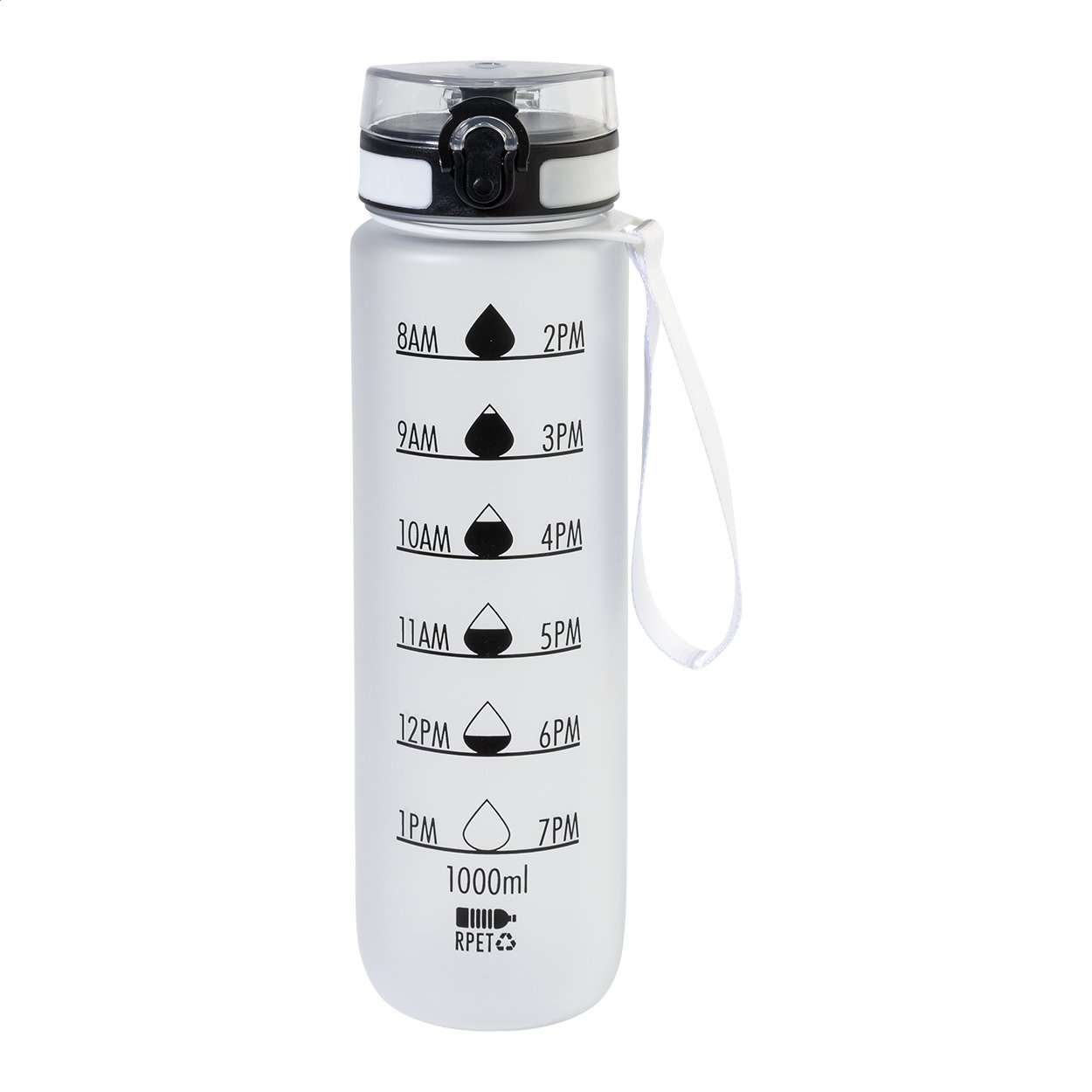 Borraccia in RPET satinato, senza BPA, da 1000ml. con indicazioni motivazionali relative alla quantità d'acqua ed all'orario in cui assumerla, dotata di tappo flip-top ad apertura automatica con chiusura di sicurezza e tracolla. Non adatta a contenere bevande gassate.