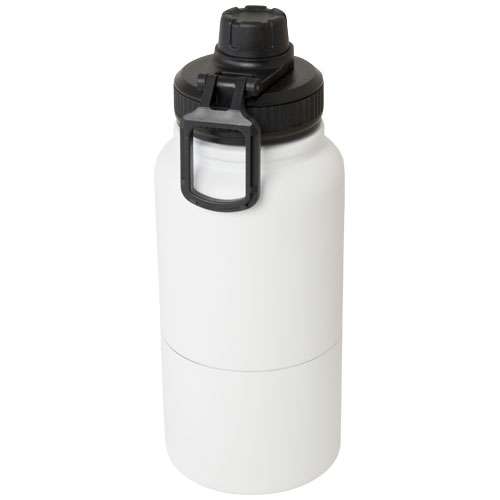 Borraccia termica multiuso in acciaio inossidabile con certificazione RCS dotata di contenitore rimovibile. La parte superiore della borraccia è costituita da un thermos con isolamento in rame con capacità di 530 ml, che mantiene le bevande calde o fredde per diverse ore. La parte inferiore è costituita da un contenitore a doppia parete dalla capacità massima di 340 ml. Può essere utilizzato come tazza per le bevande fredde preferite o per snack e altri piccoli oggetti. Fornita in una confezione regalo in cartone riciclato.