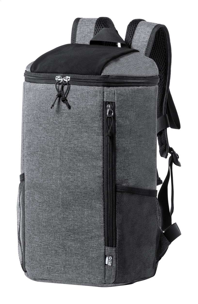 Zaino termico in poliestere 600D RPET con cerniera nella tasca principale, imbottitura in PEVA, tasche laterali in rete, spallacci imbottiti ed etichetta RPET.