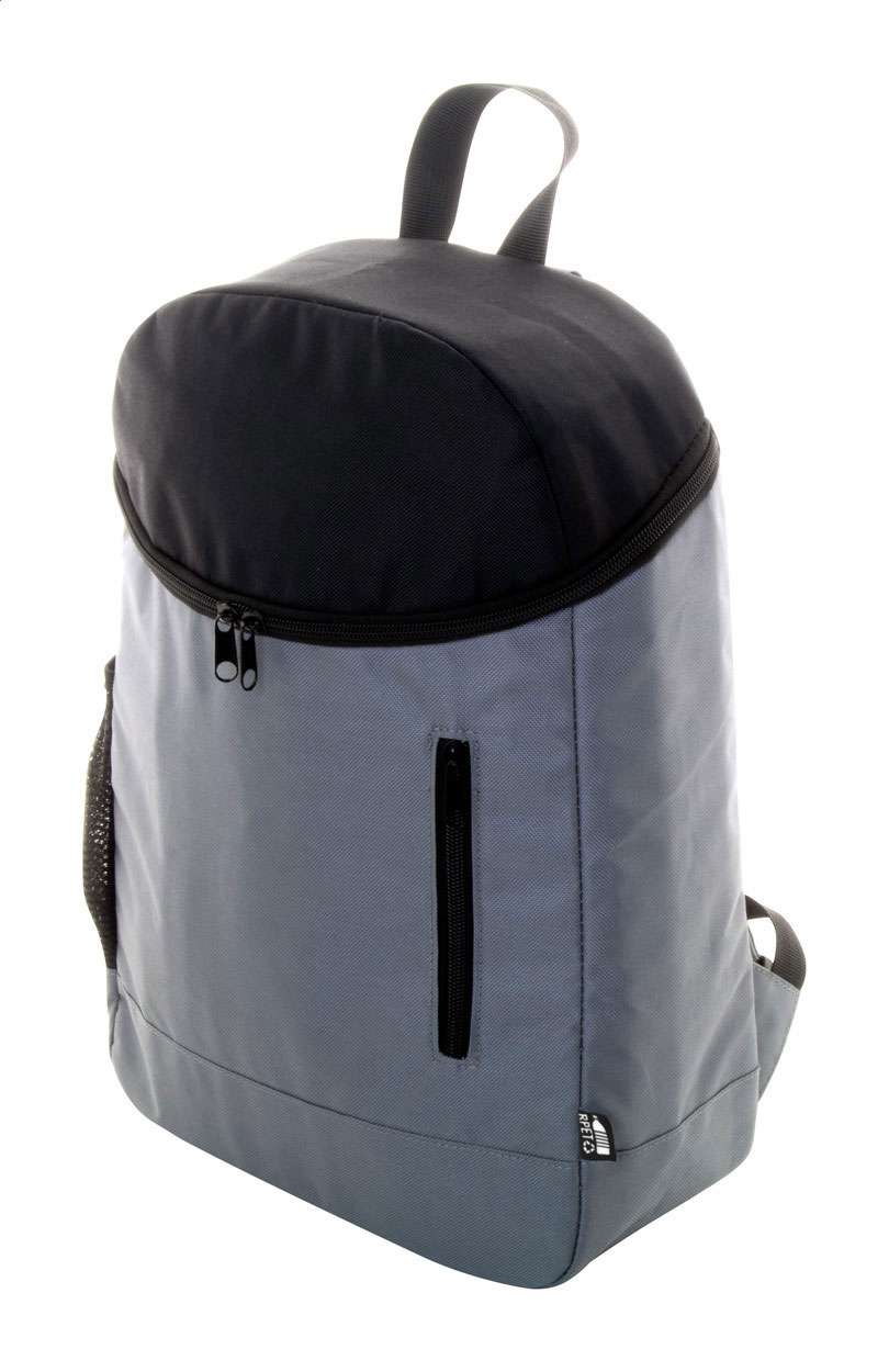 Zaino termico in poliestere 600D RPET, con imbottitura in alluminio, tasca laterale in rete, scomparto principale con cerniera, tasca frontale ed etichetta RPET.