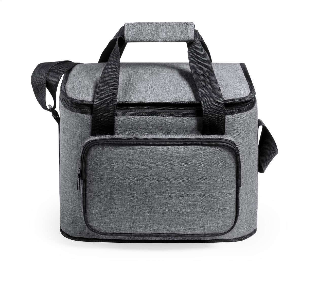 Borsa termica in poliestere 600D RPET con imbottitura in PEVA, scompartimenti con cerniera, manici con velcro e tracolla regolabile. Etichetta RPET.