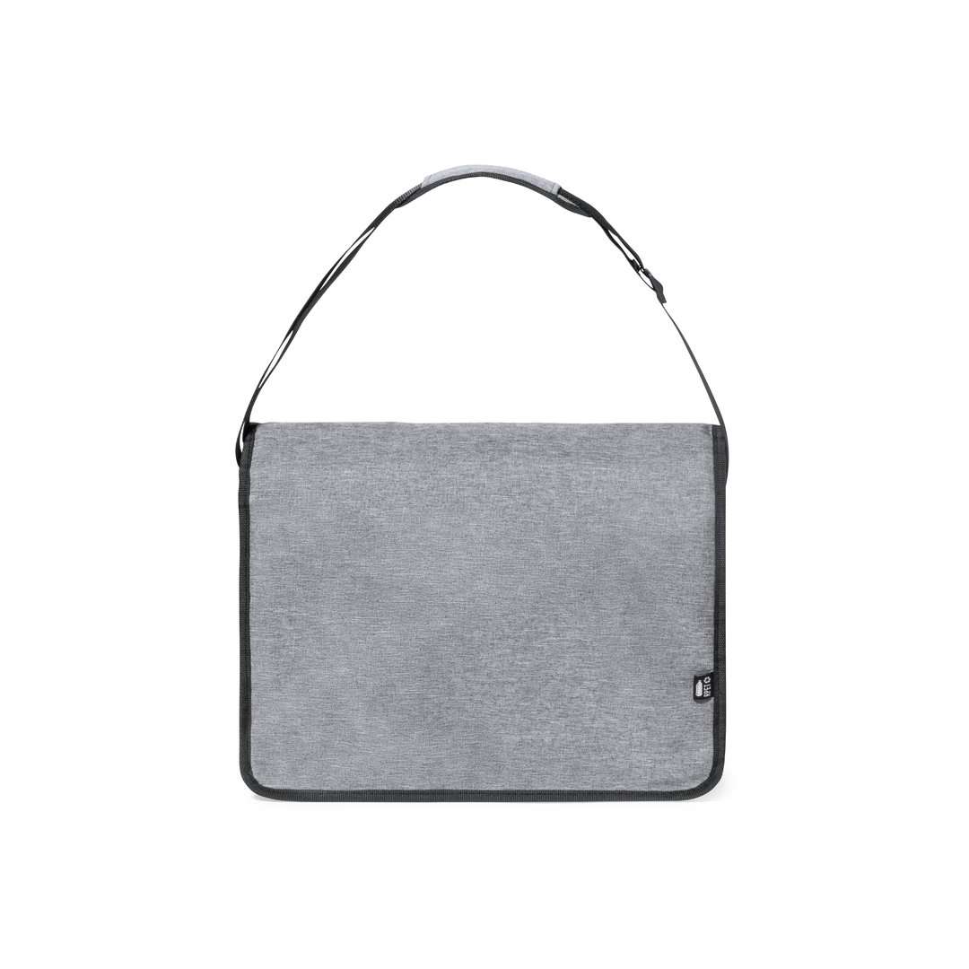 Borsa a tracolla in resistente poliestere 600D RPET. Completamente imbottita, con ampia patta frontale, chiusura in velcro e finiture nere. Scomparto principale con fodera interna, tracolla regolabile e imbottitura per le spalle. Con logo RPET sull'etichetta esterna.Il materiale RPET è realizzato con plastica riciclata, promuovendo così il riutilizzo dei rifiuti plastici e contribuendo alla sostenibilità del pianeta.