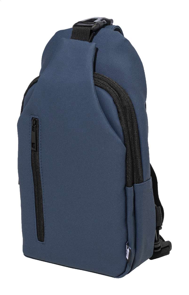 Borsa impermeabile a tracolla in poliestere 600D RPET rivestito in PU con tasche chiuse da cerniera, chiusura con fibbia, schienale imbottito, tracolla regolabile ed etichetta RPET.