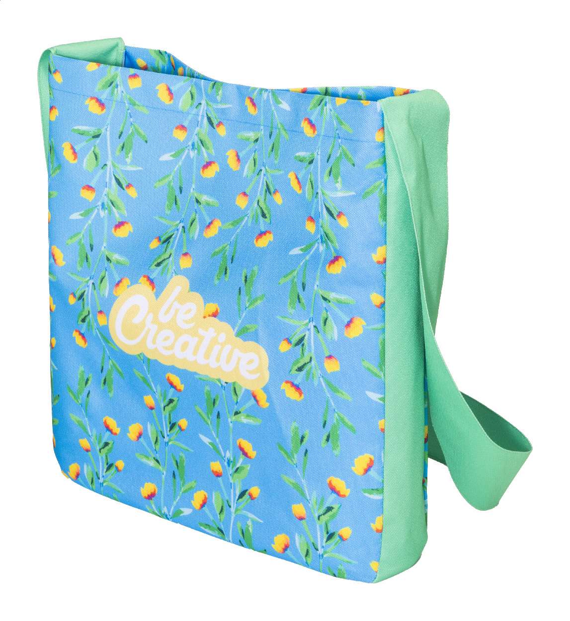 Borsa a tracolla in poliestere 600D RPET, con tracolla lunga, chiusura a bottone ed etichetta RPET. Personalizzabile con grafica stampata in sublimazione su tutta la superficie. MOQ: 25 pezzi.