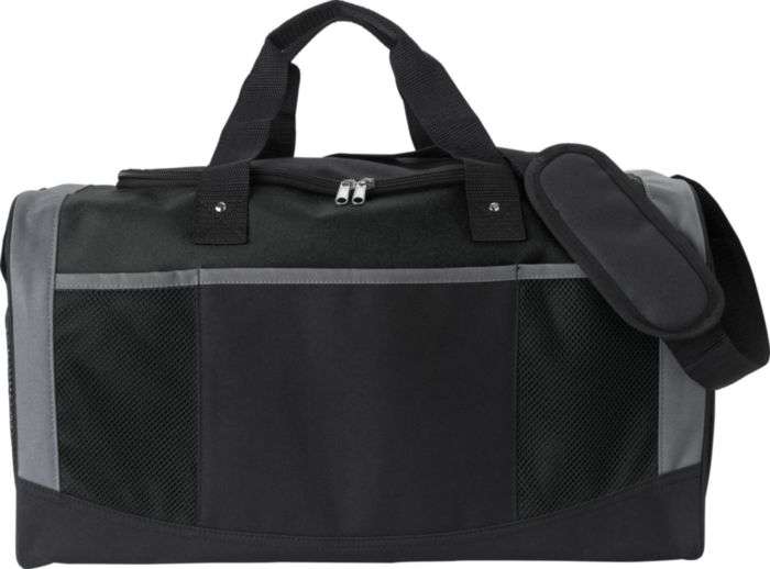 Borsone sportivo in poliestere 600 D, manici corti, tracolla regolabile, ampio scomparto con chiusura lampo, tasca laterale in rete, 3 tasche frontali, fondo rinforzato