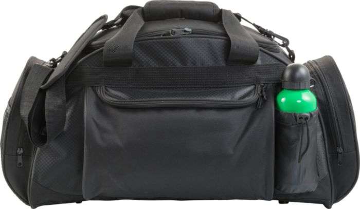 Borsone sportivo/viaggio, ampio scomparto centrale, tasca anteriore con chiusura lampo, vani laterali per bottiglia e cuffia, in poliestere 600 D