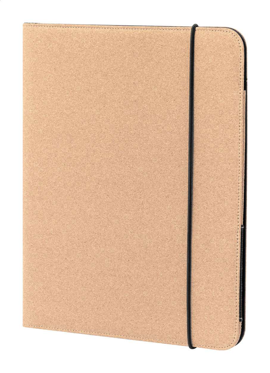 Cartella portadocumenti in sughero naturale con blocco note da 20 fogli a righe e multiple tasche interne.