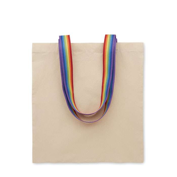 Shopper in cotone da 180 gr/m² con manici color arcobaleno. Peso massimo trasportabile 2,5 kg.