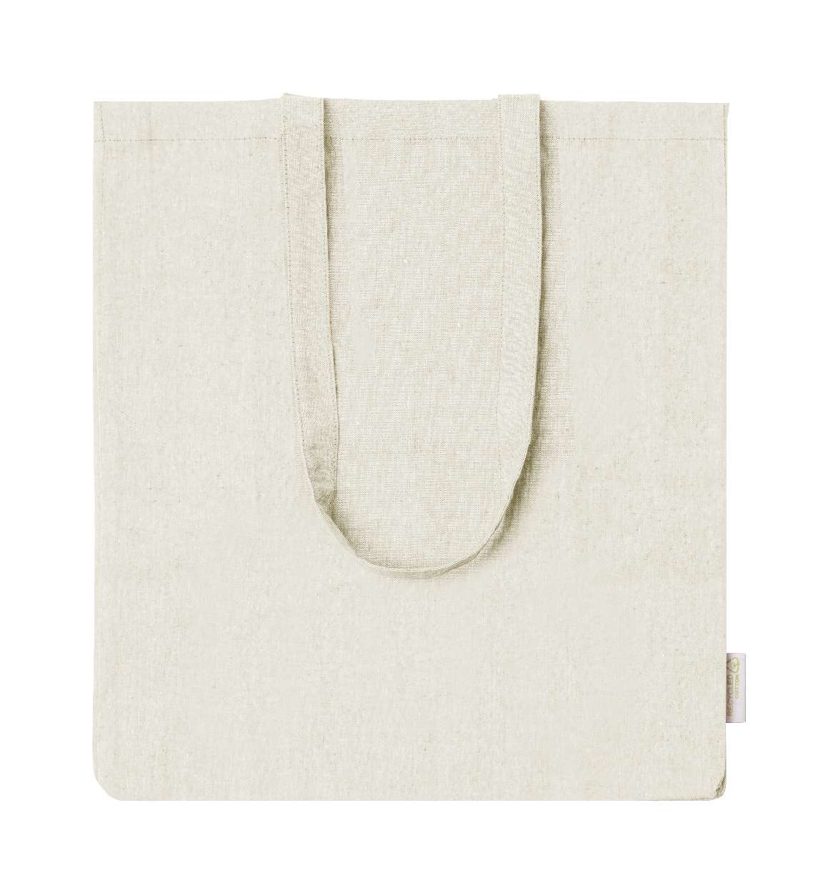 Borsa per la spesa in 100% cotone riciclato, 140 g/m². con soffietto, manici lunghi ed etichetta cotone riciclato.