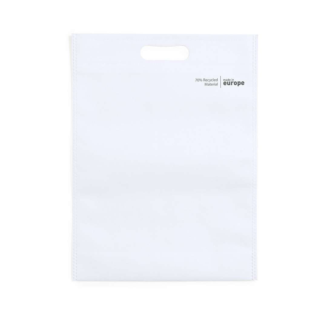 Borsa della linea Natura, realizzata in TNT riciclato da 70g/m2. Prodotta in Europa, con finitura termosaldata, soffietto alla base, manico fustellato rinforzato ed etichetta eco/made in sulla borsa.