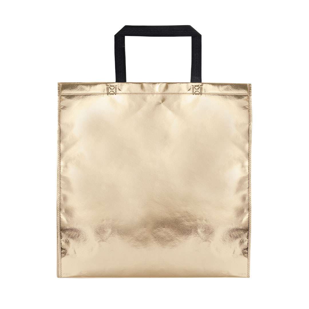 Borsa in TNT laminato con finitura metallizzata. Disponibile nei colori oro, argento e oro rosa. Con manici medi rinforzati lunghi 42 cm. Finitura termosaldata, con soffietti e bordini rinforzati. Resistente fino a 7 kg di peso.
