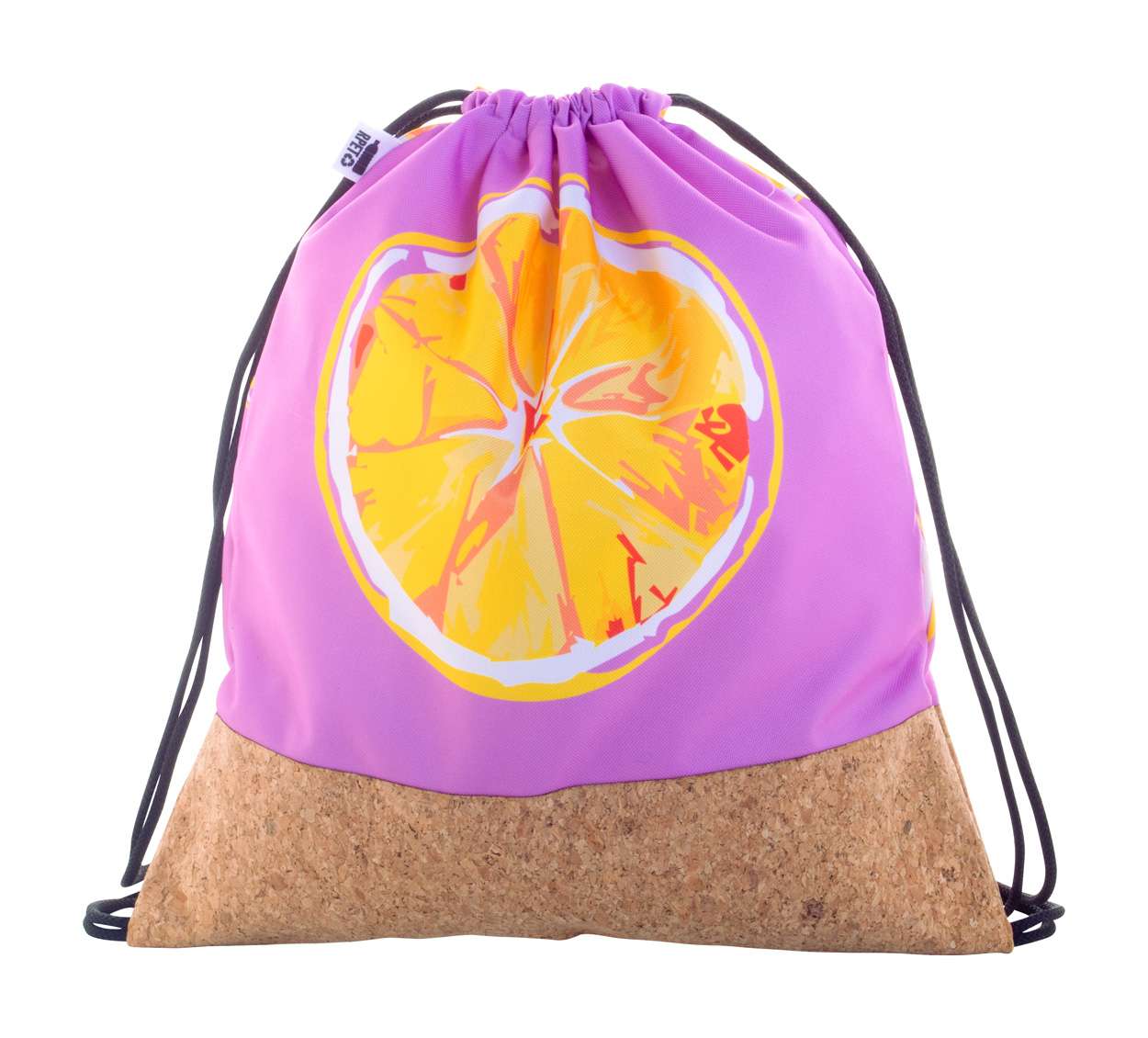 Sacca con coulisse personalizzabile in poliestere RPET 600D e sughero naturale. Con grafica stampata in sublimazione su tutta la superficie ed etichetta in RPET. MOQ: 25 pezzi.