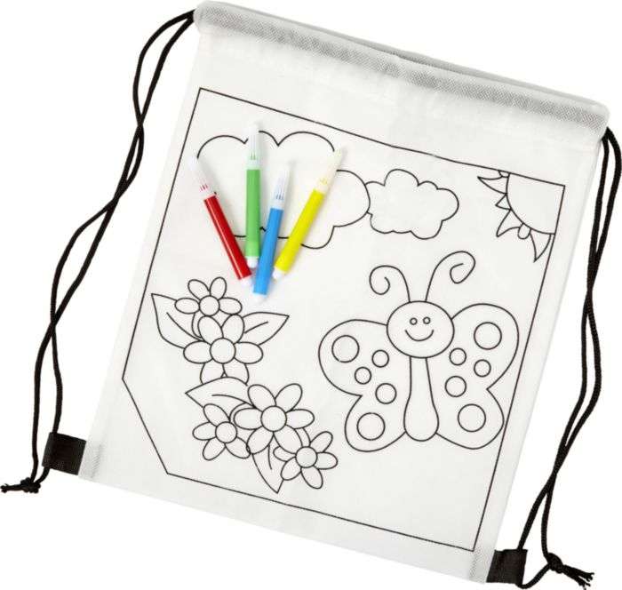 Zaino a sacca da colorare, chiusura a coulisse, include 4 pennarelli in polybag, verde, rosso, giallo e blu, in TNT 80 gr/m²
