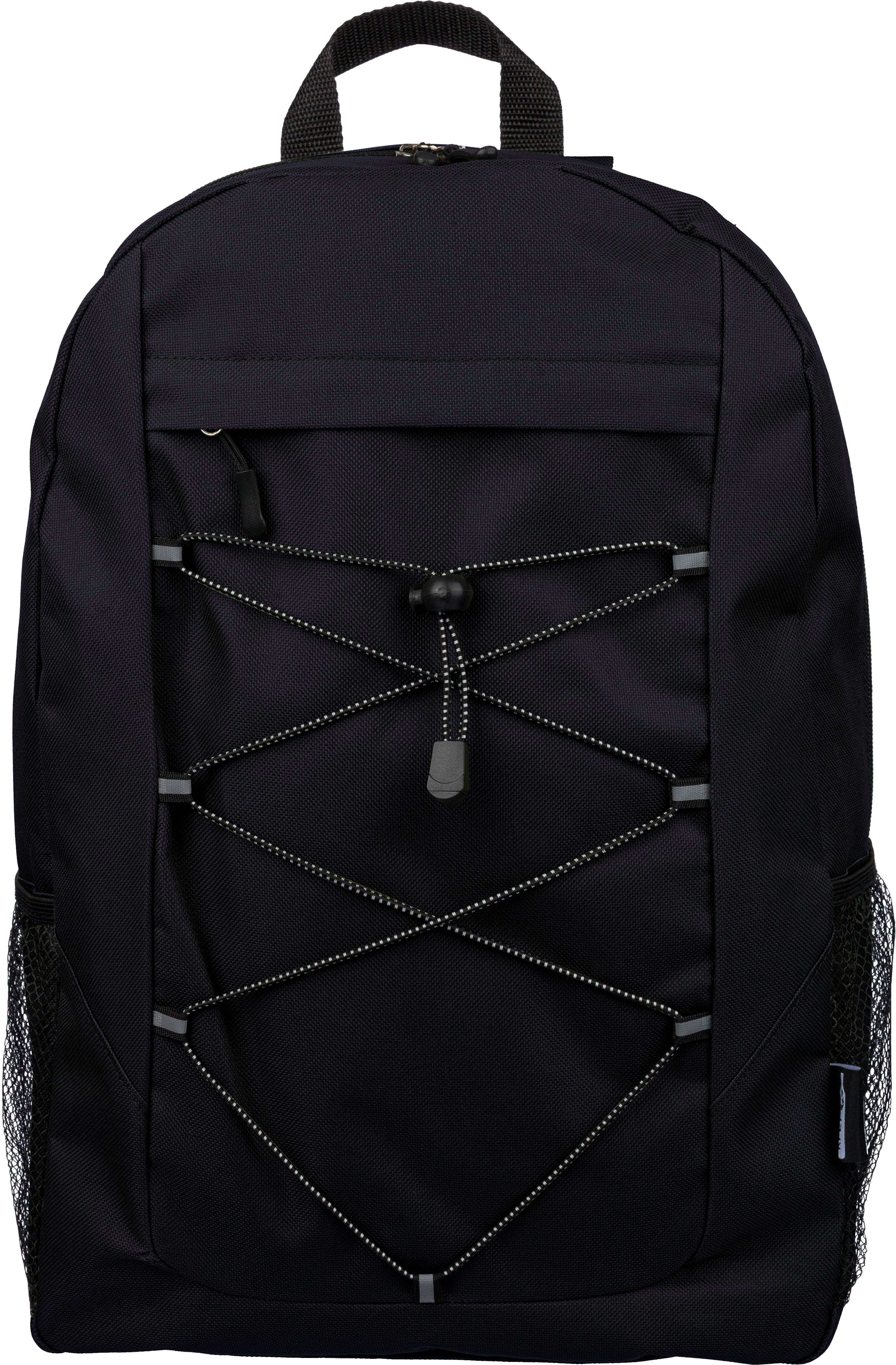 Zaino adventure in poliestere 600 D rPET, chiusura a coulisse e ampio scomparto principale con chiusura lampo, dotato di tasche laterali in rete, bande elastiche frontali per fissare una coperta oppure una borraccia, piccola tasca frontale aperta con zip a scopo decorativo, spallacci regolabili ed etichetta rPET esterna.