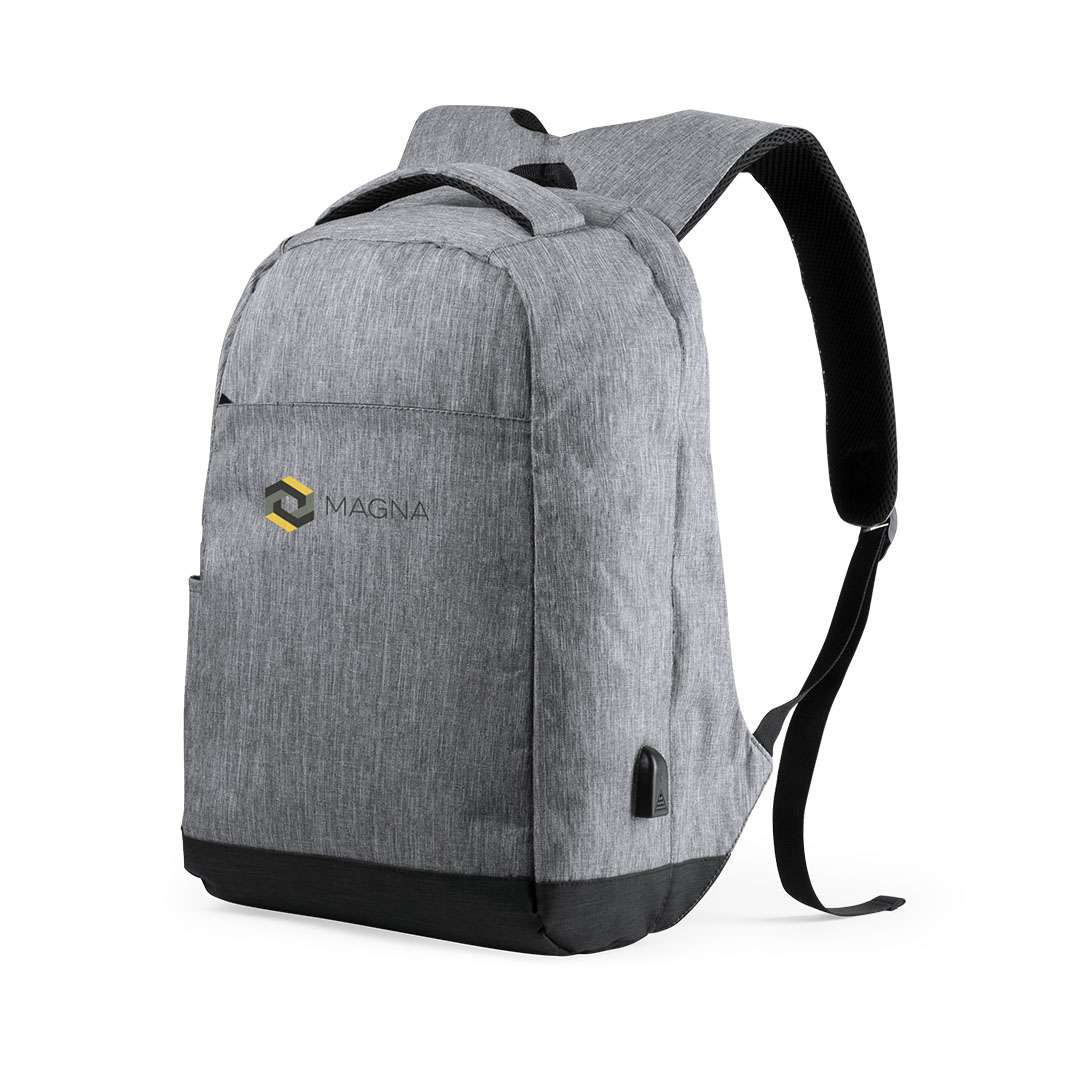 Zaino antifurto in resistente poliestere 300D. Tessuto di alta qualità resistente ai tagli e ai graffi, con tasca antifurto sul retro per riporre gli oggetti di valore. Scomparto principale con cerniera dotato di connessione per powerbank - non incluso - e due scomparti interni separati e imbottiti per laptop fino a 15" e tablet fino a 10", oltre a ulteriori tasche interne. È presente anche una tasca esterna frontale con chiusura a zip. Comodo da trasportare grazie allo schienale imbottito, alle maniglie ergonomiche e regolabili e all'attacco per il trolley.