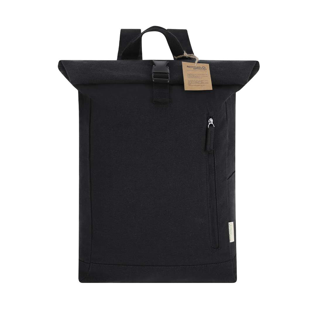 Zaino realizzato in materiale canvas riciclato. Scomparto principale ad alta capacità con fibbia di sicurezza e chiusura in velcro, più una tasca frontale con chiusura a cerniera invisibile. Tasca ad accesso rapido sul lato e manico superiore, spallacci regolabili ed etichetta esterna con logo Recycled Cotton.